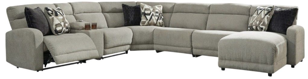 Comprend 7 pièces : fauteuil inclinable électrique avec accoudoir gauche, fauteuil inclinable électrique sans accoudoir, console avec rangement, cale, chaise longue inclinable électrique avec accoudoir droit et 2 fauteuils sans accoudoir.
