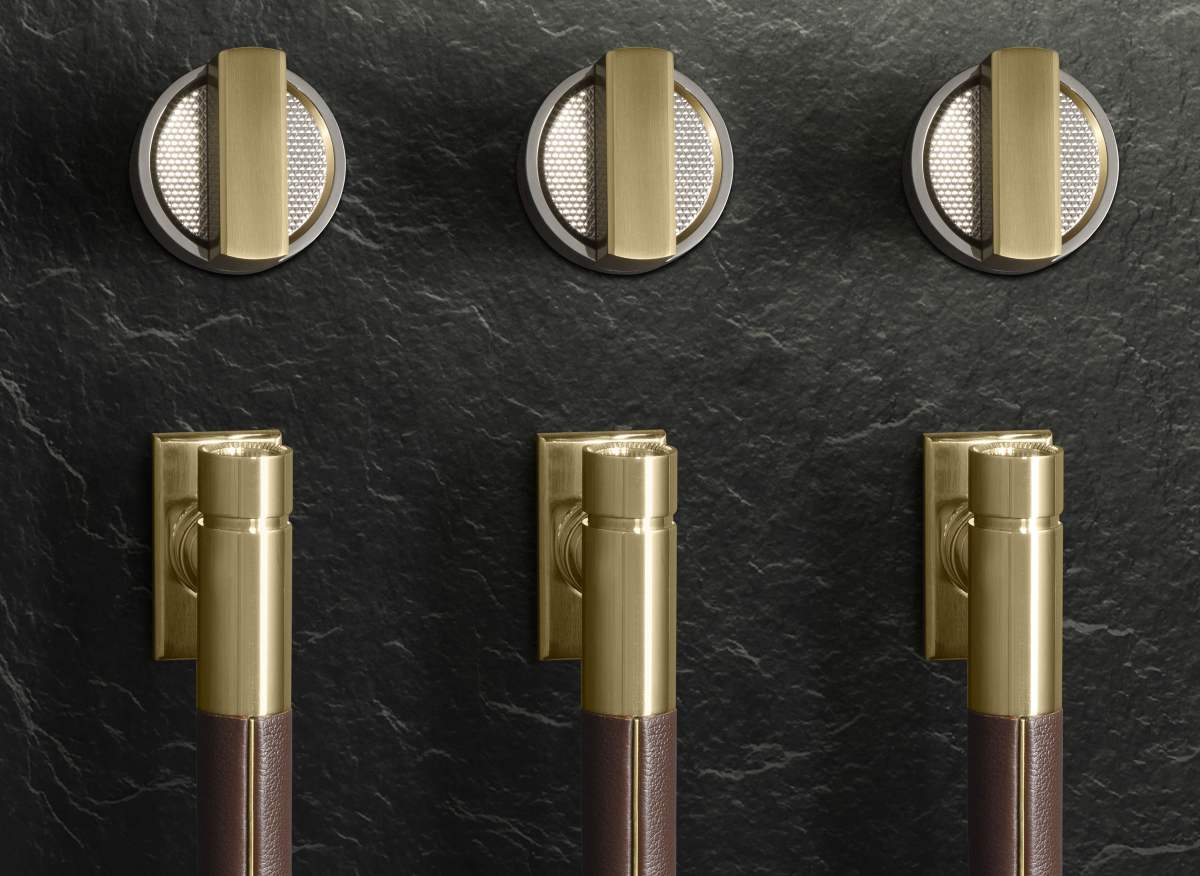 La collection LAITON présente une esthétique audacieuse et élégante, basée sur les principes fondamentaux de l'architecture classique, dans des teintes dorées et polies.