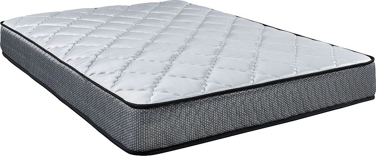 Tissu Silver Plain gris, 0,75 po (1,91 cm) de fibre en polyester, mousse ondulée, 1,38 po (3,51 cm) de mousse tout grade, 0,38 po (0,97 cm) de feutre isolant, ressorts Bonnel avec supports latéraux, 0,38 po (0,97 cm) de feutre isolant