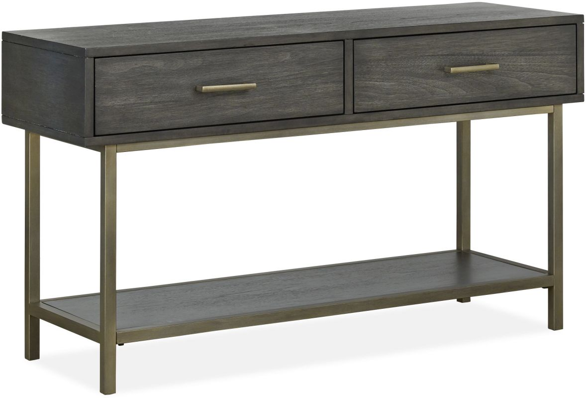 Placages de noyer, verre ambré et métal étain se combinent pour créer un attrait rétro dans Fulton. Une esthétique résolument "mod" est créée lorsque les plateaux de table en bois s'étendent au-delà des piétements tubulaires carrés en métal finition étain, semblant flotter avec finesse.En savoir plus