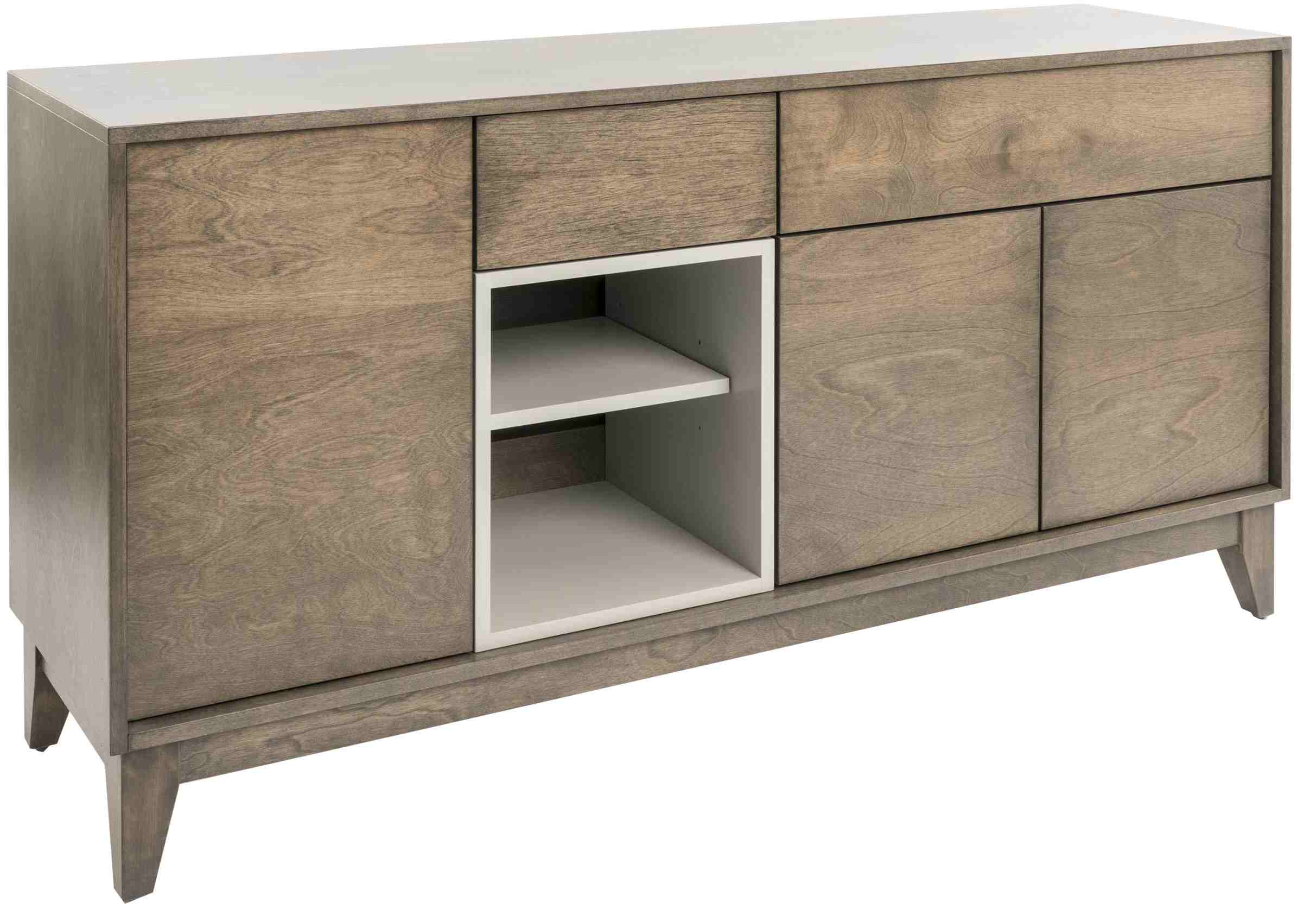 Ce buffet comprend une grande porte, deux petites portes, deux tiroirs avec ''coulisses quadro'', un espace ouvert, trois tablettes ajustables en bois et un fini de placage de merisier.Read More