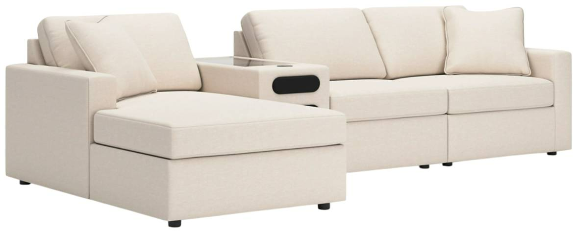 Comprend 4 éléments modulaires : méridienne d'angle avec accoudoir gauche, console audio avec rangement, fauteuil sans accoudoirs et fauteuil d'angle avec accoudoir droit.