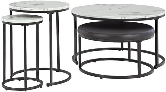 Rehaussez le niveau en matière de forme et de fonctionnalité contemporaines avec cet ensemble de tables gigognes polyvalentes. Leurs plateaux en simili marbre de Carrare s'associent à des structures tubulaires en métal au fini foncé pour créer un look simple et chic qui ne manquera pas d'impressionner. Le revêtement en simili cuir noir confère une touche moderne au pouf.Read More