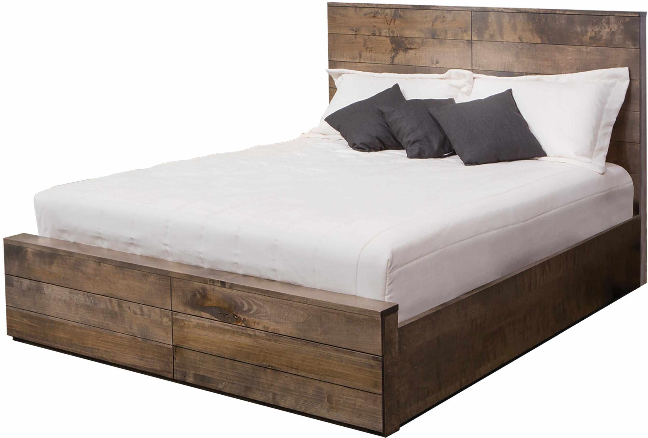 Le très grand lit est doté d'une tête de lit en bois, de deux tiroirs avec des coulisses à pleine extension, et le dessus et la façade sont en merisier massif au fini rustique avec les côtés en merisier laminé.Read More