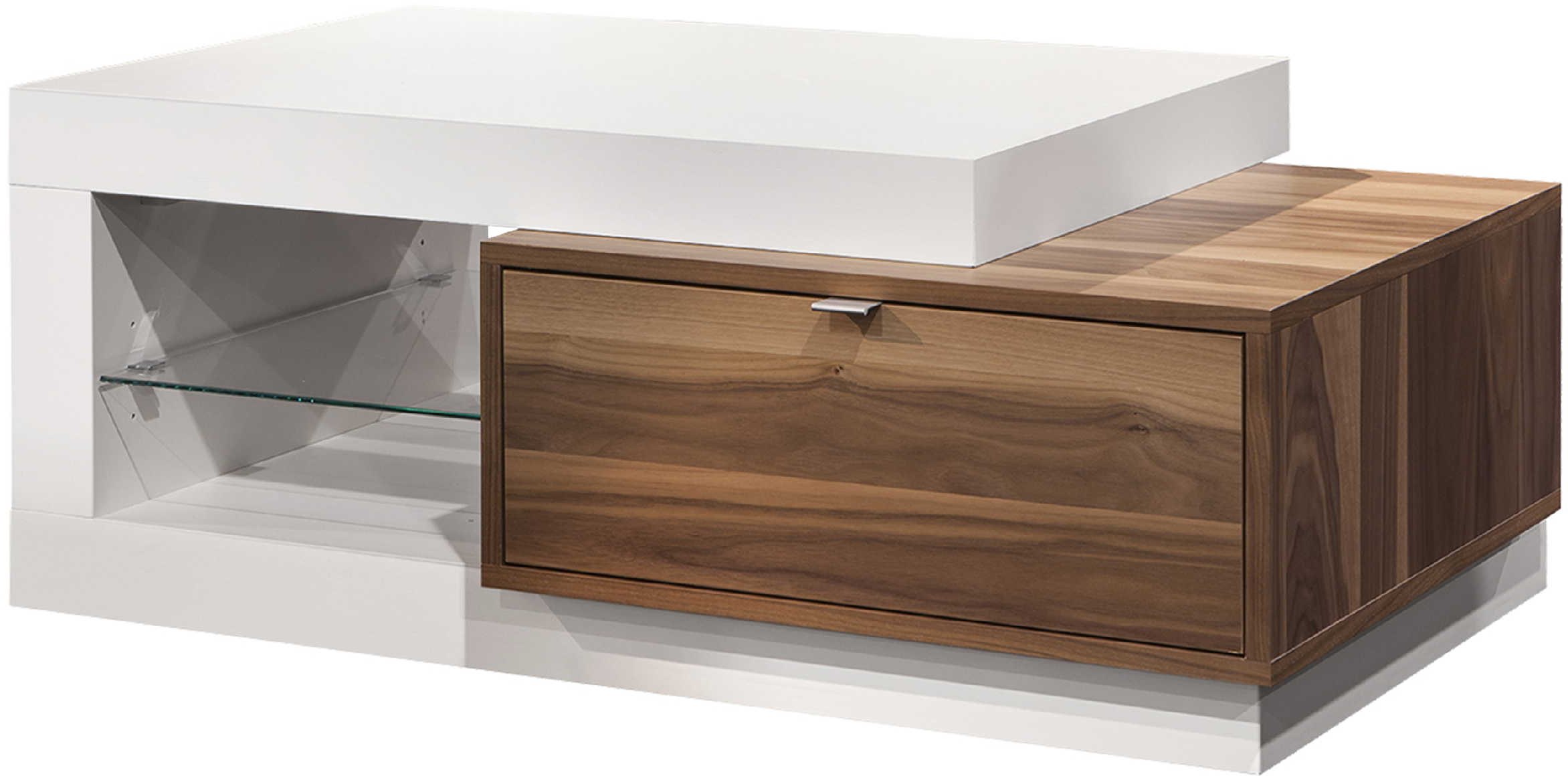 Cette table de centre présente une finition en placage de noyer, un tiroir avec des coulisses "quadro", une tablette réglable en verre et un espace de rangement.Read More