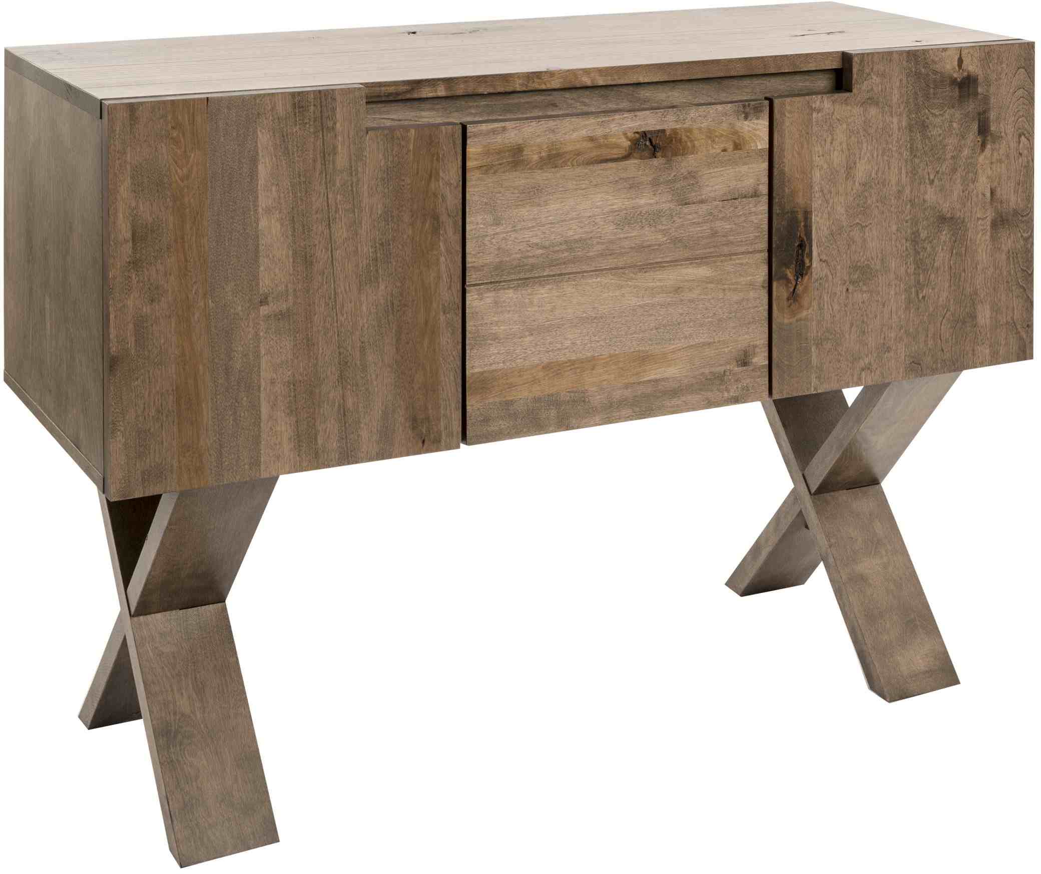 Cette table console comporte deux tiroirs, des tablettes réglables et une finition rustique en merisier massif.Read More