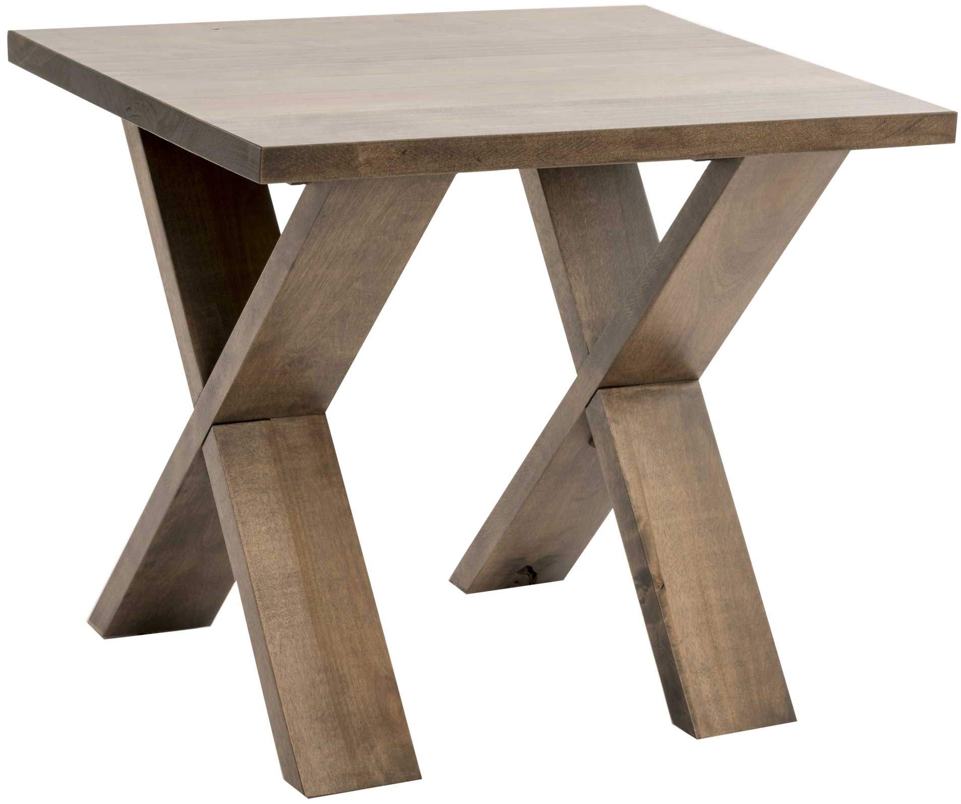 Cette table de bout est de forme rectangulaire, avec des pieds en forme de "X" et elle est fabriquée en merisier massif avec un fini rustique.Read More
